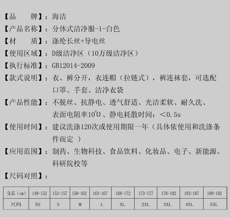 【配置】:衣、裤分开,衣连帽(拉链式),裤连袜套,可选配口罩、手套、洁净衣袋